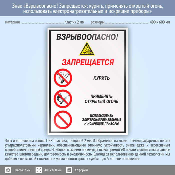 Знак «Взрывоопасно! Запрещается: курить, применять открытый огонь, использовать электронагревательные и искрящие приборы», КЗ-10 (пластик, 400х600 мм) в Химках купить