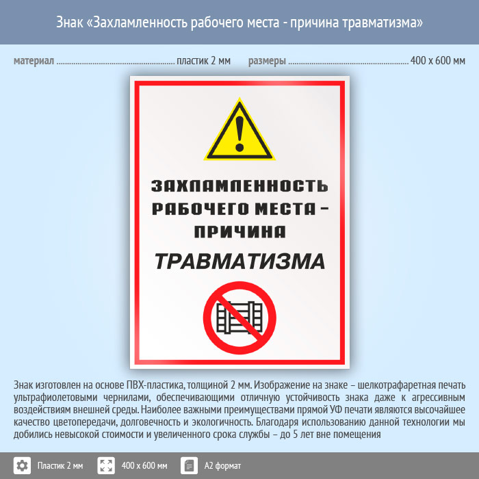 Знак «Захламленность рабочего места - причина травматизма», КЗ-21 (пластик, 400х600 мм) в Химках купить