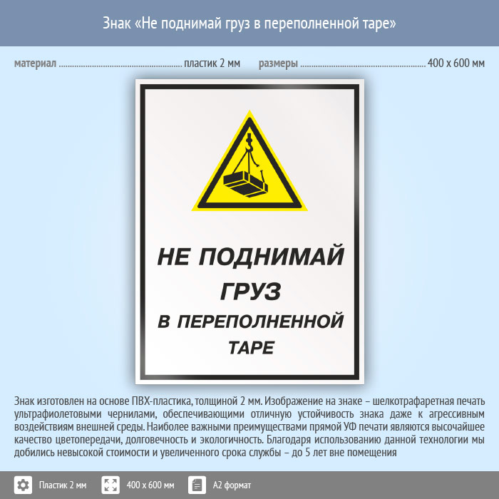 Знак «Не поднимай груз в переполненной таре», КЗ-26 (пластик, 400х600 мм) в Химках купить