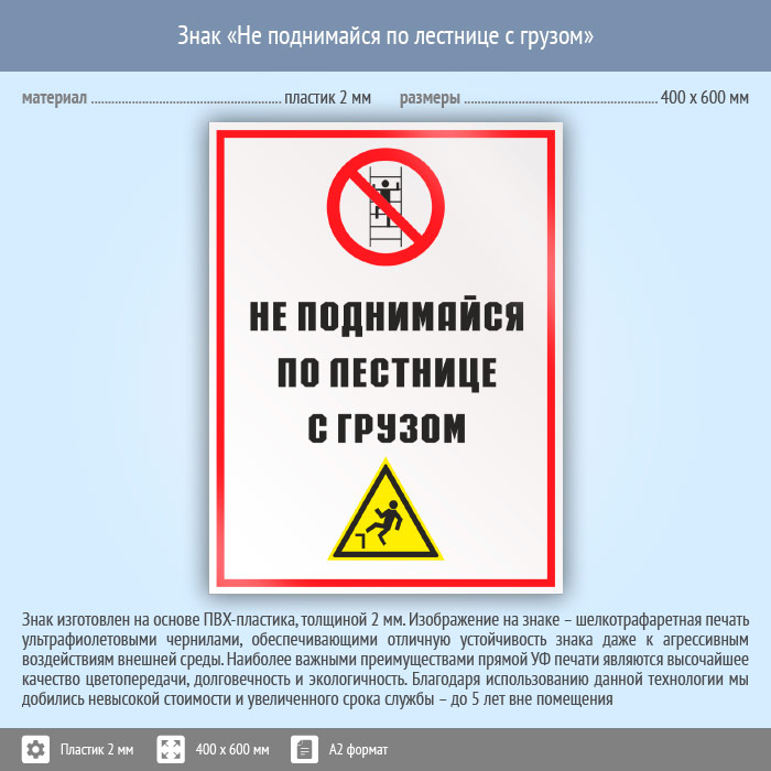 Знак «Не поднимайся по лестнице с грузом», КЗ-28 (пластик, 400х600 мм) в Химках купить
