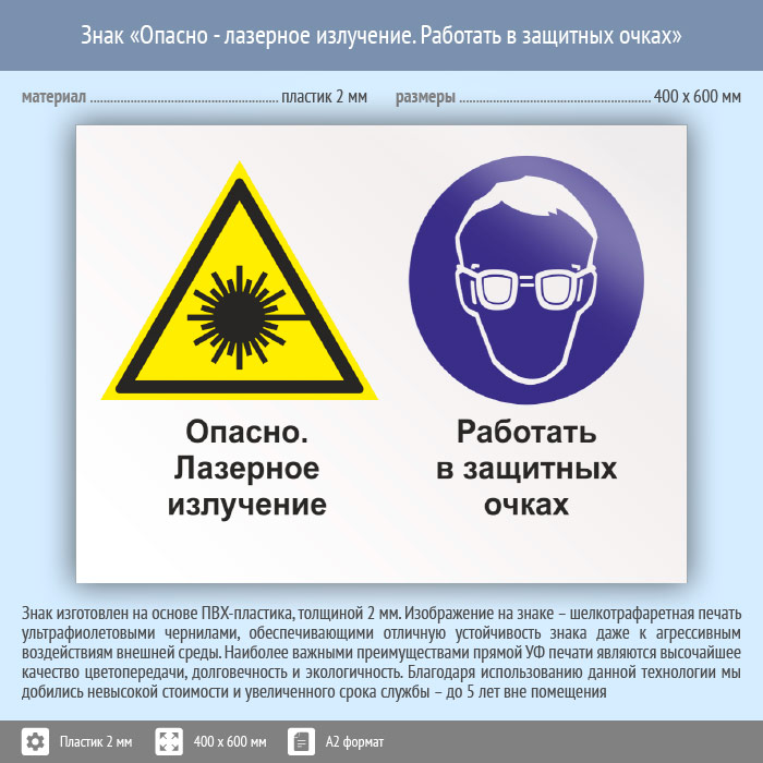 Знак «Опасно - лазерное излучение. Работать в защитных очках», КЗ-38 (пластик, 600х400 мм) в Химках купить