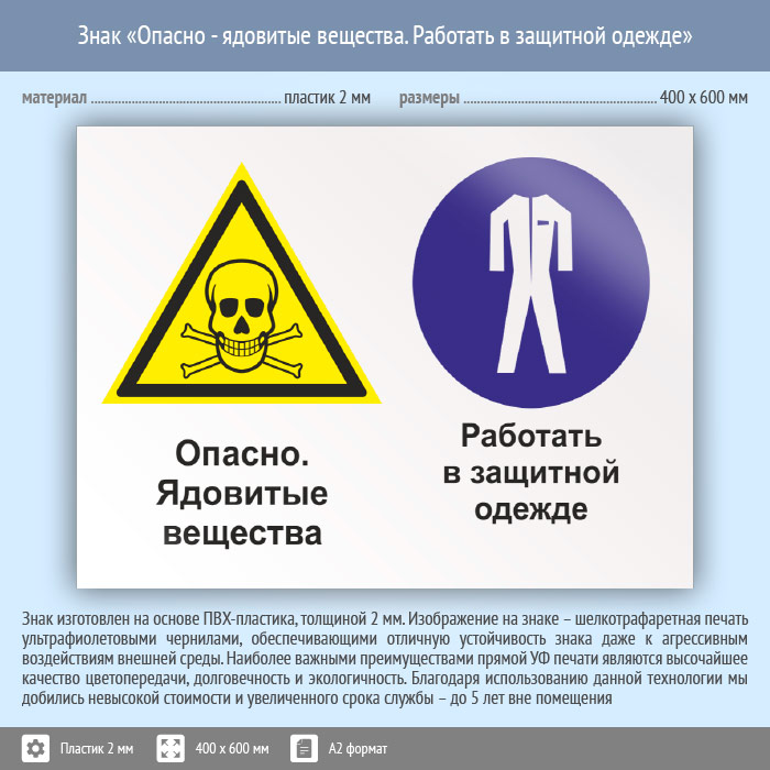 Знак «Опасно - ядовитые вещества. Работать в защитной одежде», КЗ-42 (пластик, 600х400 мм) в Химках купить