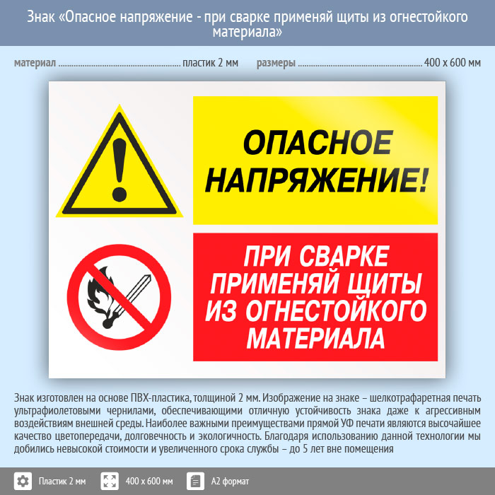 Знак «Опасное напряжение - при сварке применяй щиты из огнестойкого материала», КЗ-46 (пластик, 600х400 мм) в Химках купить