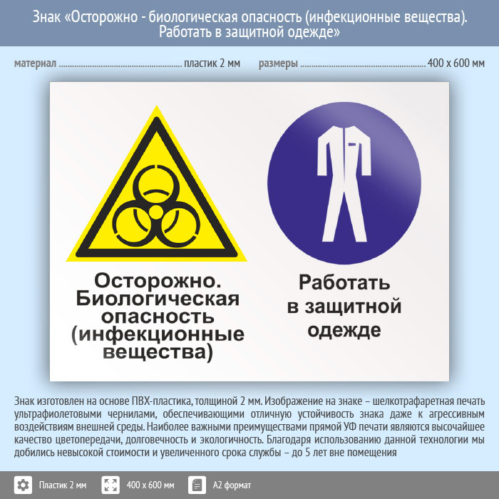 Знак «Осторожно - биологическая опасность (инфекционные вещества). Работать в защитной одежде», КЗ-53 (пластик, 600х400 мм) в Химках купить