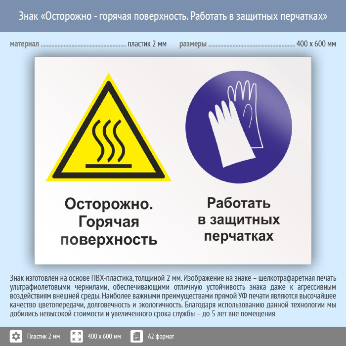 Знак «Осторожно - горячая поверхность. Работать в защитных перчатках», КЗ-55 (пластик, 600х400 мм) в Химках купить