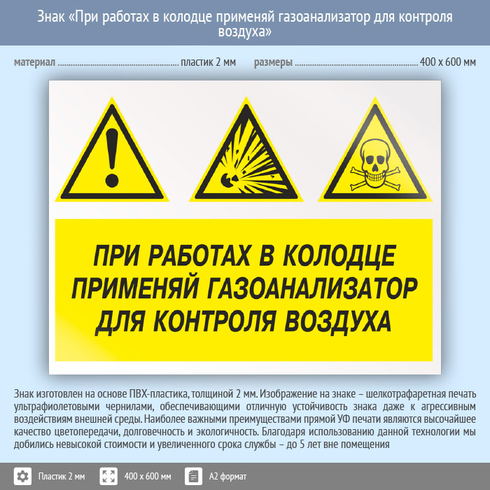 Знак «При работах в колодце применяй газоанализатор для контроля воздуха», КЗ-74 (пластик, 600х400 мм) в Химках купить