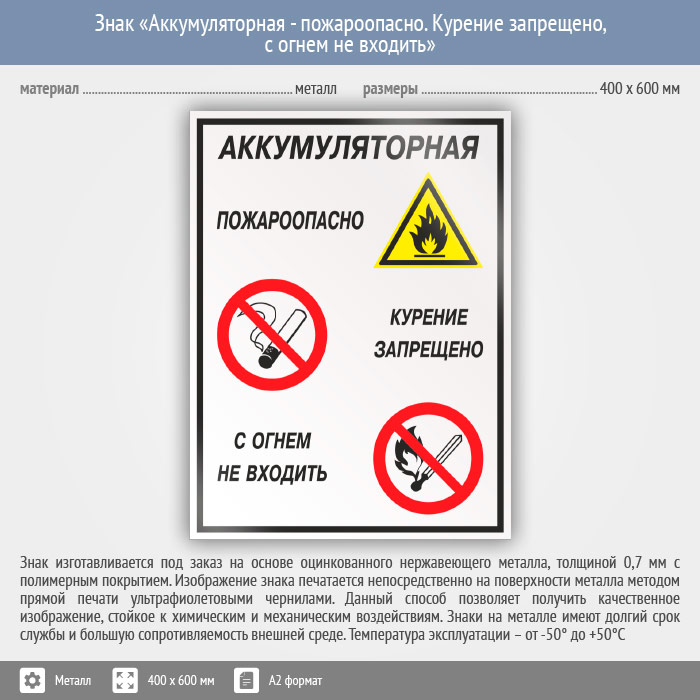 Знак «Аккумуляторная - пожароопасно. Курение запрещено, с огнем не входить», КЗ-01 (металл, 400х600 мм) в Химках купить