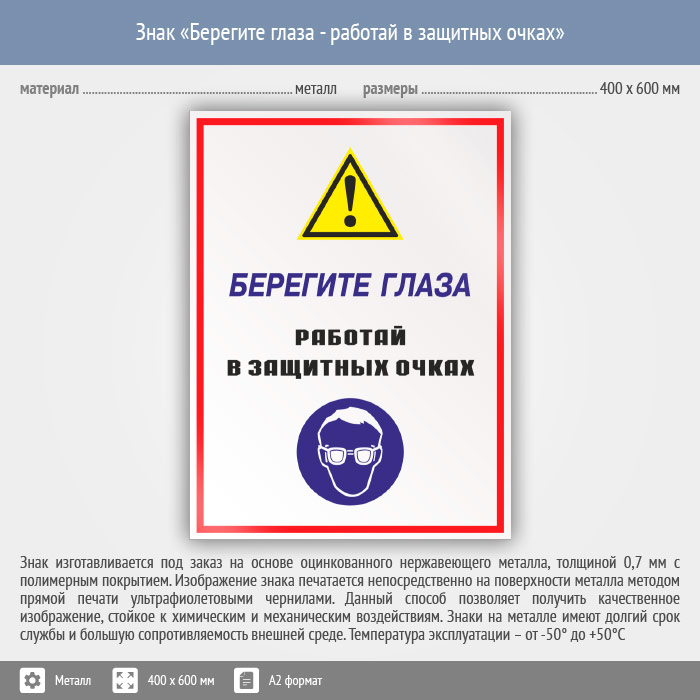 Знак «Берегите глаза - работай в защитных очках», КЗ-04 (металл, 400х600 мм) в Химках купить