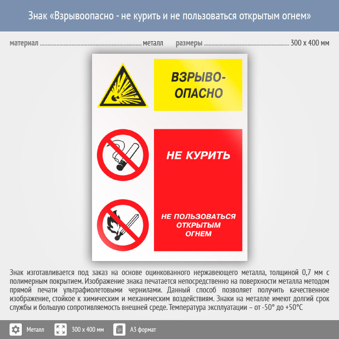 Знак «Взрывоопасно - не курить и не пользоваться открытым огнем», КЗ-08 (металл, 300х400 мм) в Химках купить
