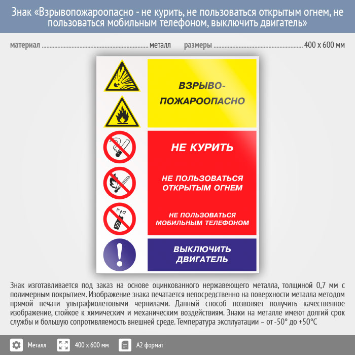 Знак «Взрывопожароопасно - не курить, не пользоваться открытым огнем, не пользоваться мобильным телефоном, выключить двигатель», КЗ-11 (металл, 400х600 мм) в Химках купить
