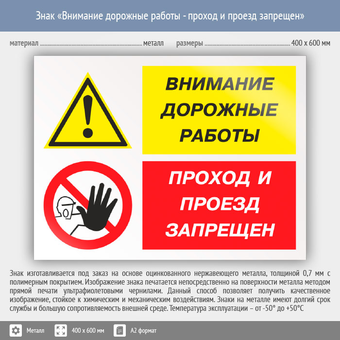 Знак «Внимание дорожные работы - проход и проезд запрещен», КЗ-14 (металл, 600х400 мм) в Химках купить