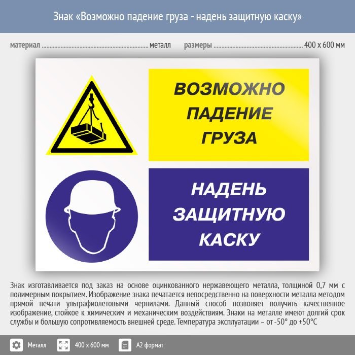Знак «Возможно падение груза - надень защитную каску», КЗ-17 (металл, 600х400 мм) в Химках купить