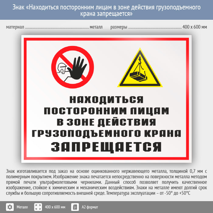 Знак «Находиться посторонним лицам в зоне действия грузоподъемного крана запрещается», КЗ-23 (металл, 600х400 мм) в Химках купить