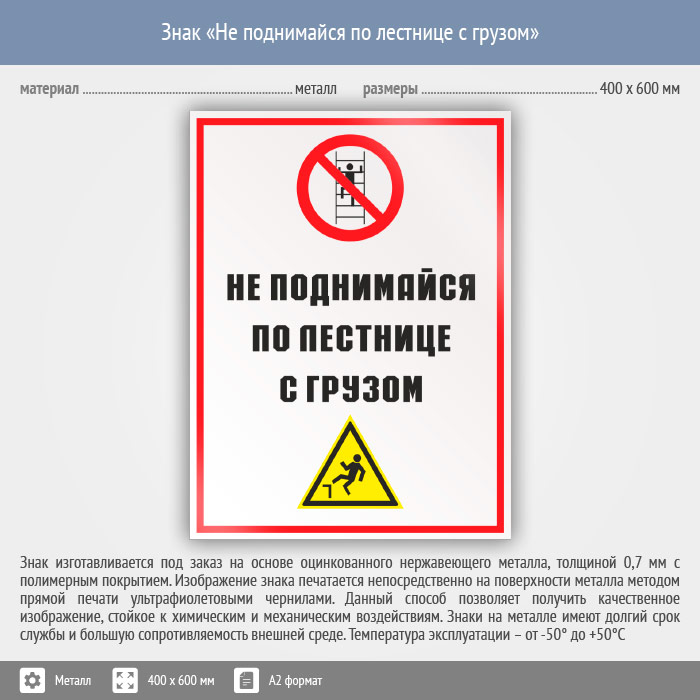 Знак «Не поднимайся по лестнице с грузом», КЗ-28 (металл, 400х600 мм) в Химках купить