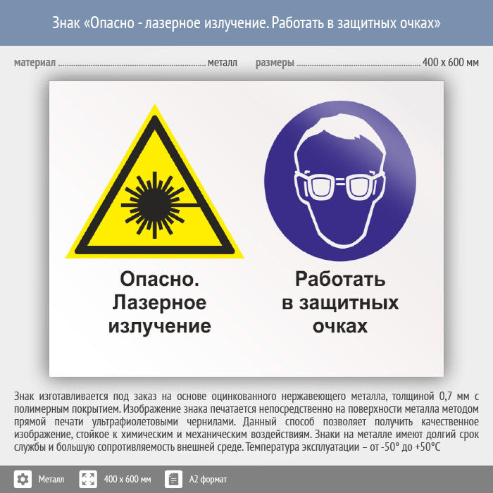 Знак «Опасно - лазерное излучение. Работать в защитных очках», КЗ-38 (металл, 600х400 мм) в Химках купить
