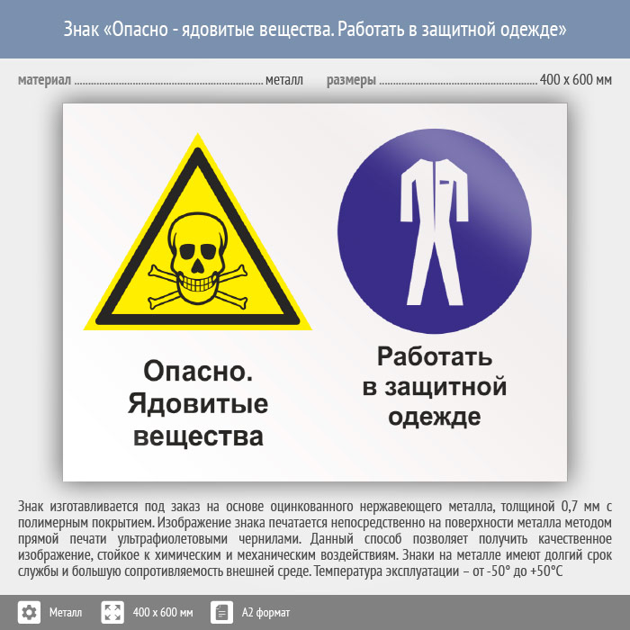 Знак «Опасно - ядовитые вещества. Работать в защитной одежде», КЗ-42 (металл, 600х400 мм) в Химках купить