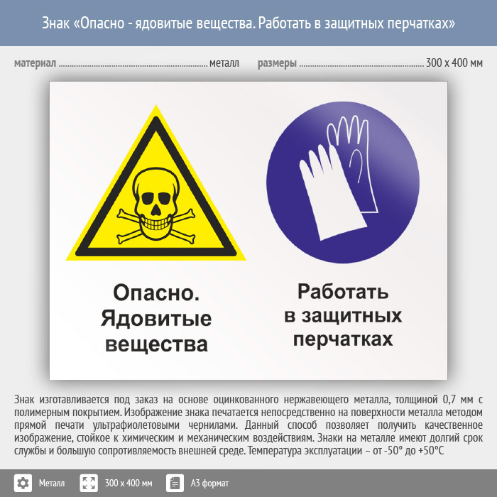 Знак «Опасно - ядовитые вещества. Работать в защитных перчатках», КЗ-43 (металл, 400х300 мм) в Химках купить