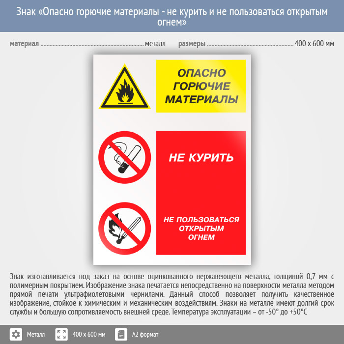 Знак «Опасно горючие материалы - не курить и не пользоваться открытым огнем», КЗ-45 (металл, 400х600 мм) в Химках купить