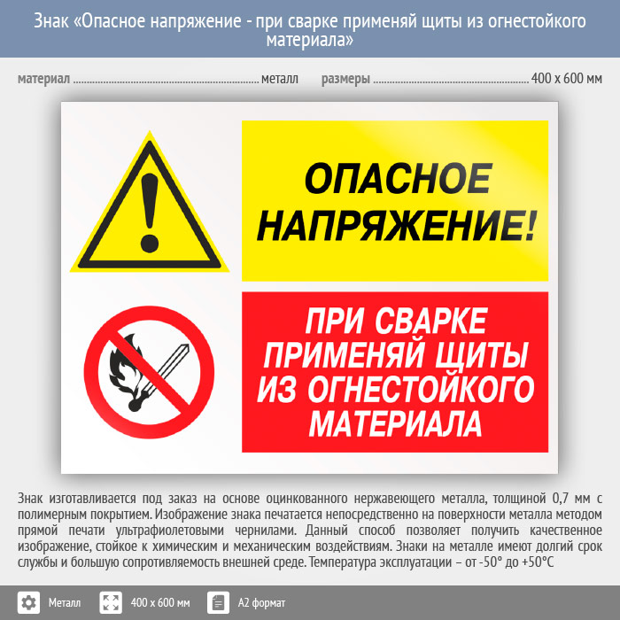 Знак «Опасное напряжение - при сварке применяй щиты из огнестойкого материала», КЗ-46 (металл, 600х400 мм) в Химках купить