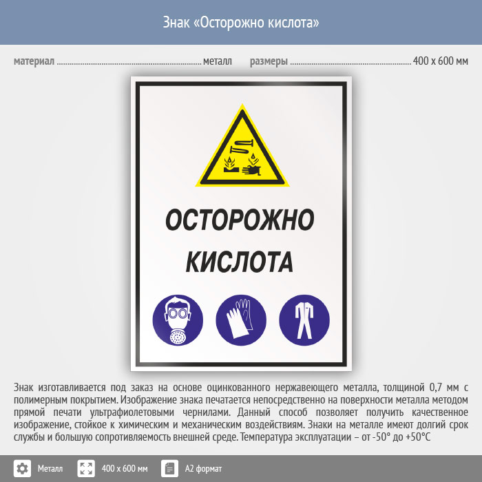 Знак «Осторожно кислота», КЗ-61 (металл, 400х600 мм) в Химках купить