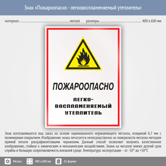Знак «Пожароопасно - легковоспламеняемый утеплитель», КЗ-68 (металл, 400х600 мм) в Химках купить