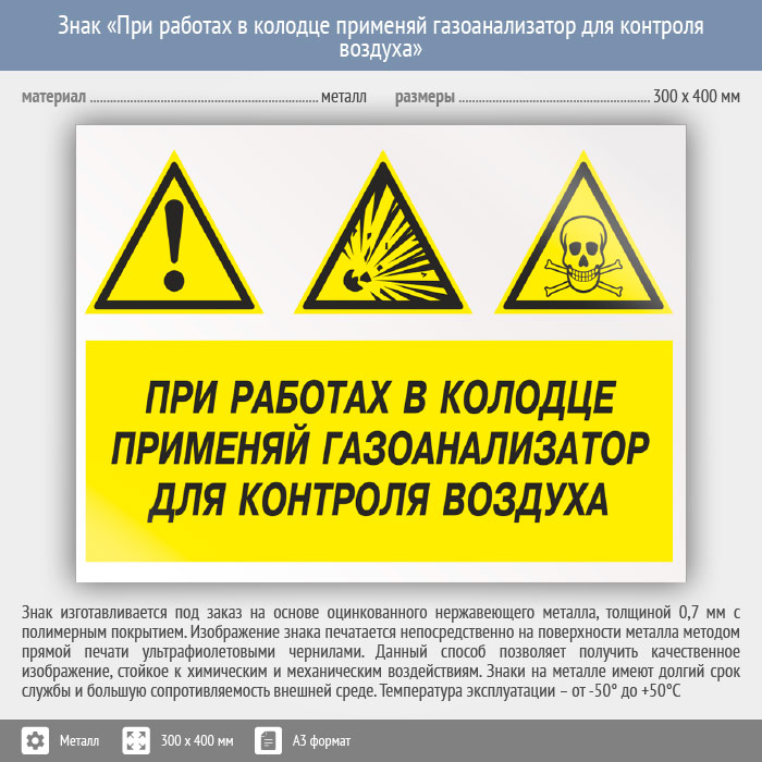 Знак «При работах в колодце применяй газоанализатор для контроля воздуха», КЗ-74 (металл, 400х300 мм) в Химках купить