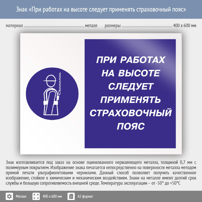 Знак «При работах на высоте следует применять страховочный пояс», КЗ-75 (металл, 600х400 мм) в Химках купить