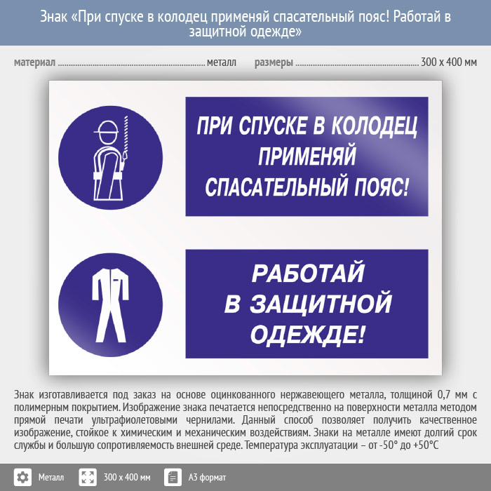 Знак «При спуске в колодец применяй спасательный пояс! Работай в защитной одежде», КЗ-76 (металл, 400х300 мм) в Химках купить