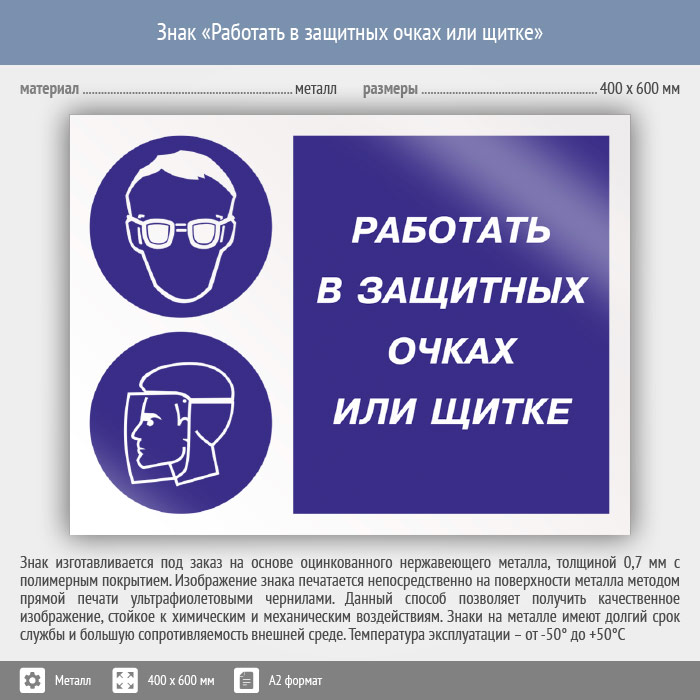Знак «Работать в защитных очках или щитке», КЗ-80 (металл, 600х400 мм) в Химках купить