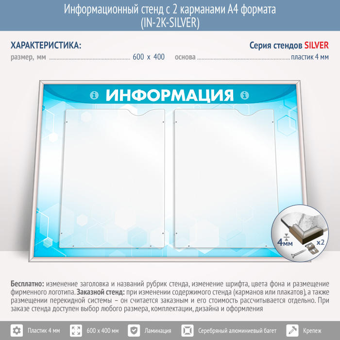 Информационный стенд с 2 карманами А4 формата (IN-2K-SILVER) в Химках купить