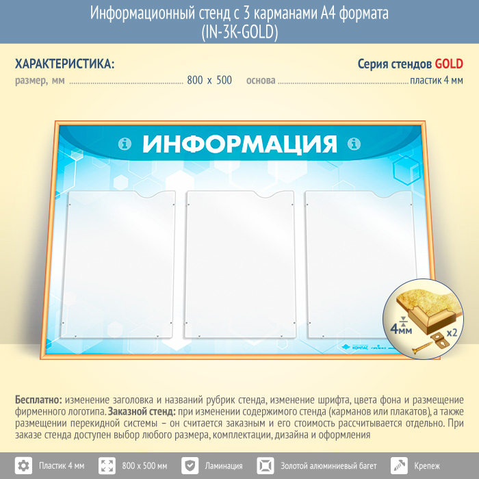 Информационный стенд с 3 карманами А4 формата (IN-3K-GOLD) в Химках купить