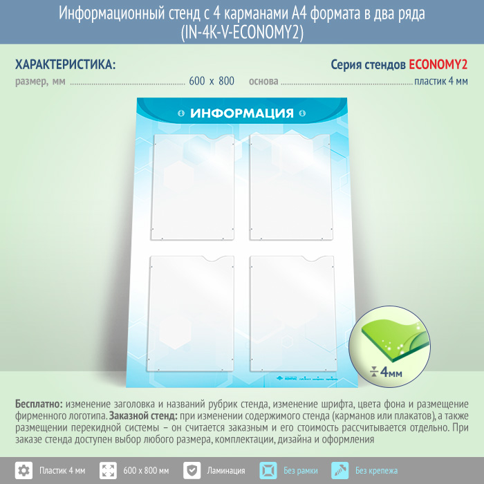 Информационный стенд с 4 карманами А4 формата в два ряда (IN-4K-V-ECONOMY2) в Химках купить