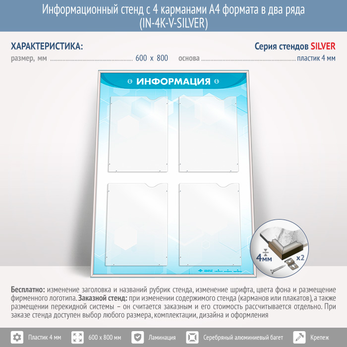 Информационный стенд с 4 карманами А4 формата в два ряда (IN-4K-V-SILVER) в Химках купить