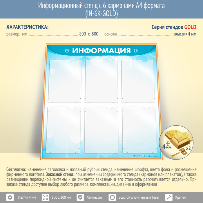 Информационный стенд с 6 карманами А4 формата (IN-6K-GOLD) в Химках купить