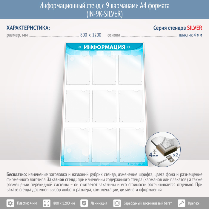 Информационный стенд с 9 карманами А4 формата (IN-9K-SILVER) в Химках купить