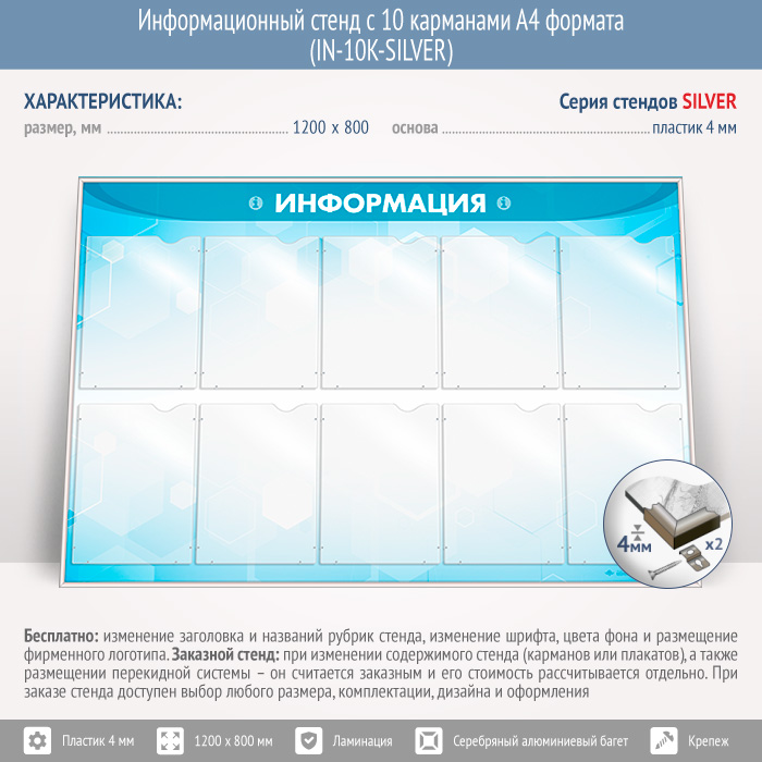 Информационный стенд с 10 карманами А4 формата (IN-10K-SILVER) в Химках купить