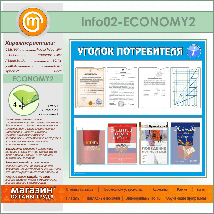 Стенд «Уголок потребителя» с 4 плоскими и 4 объемными карманами А4 формата (IN-02-ECONOMY2) в Химках купить
