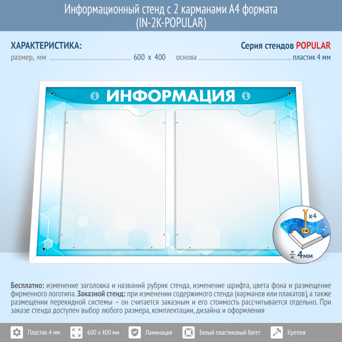 Информационный стенд с 2 карманами А4 формата предназначен для самостоятельного размещения информации – от документов, приказов и инструкций до рекламы... Часто на таких стендах размещают контактные данные, образцы заполняемых бланков, график работы, порядок приема документов в организации и прочее