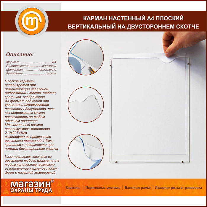 Карман настенный А4 плоский вертикальный на двустороннем скотче в Химках купить
