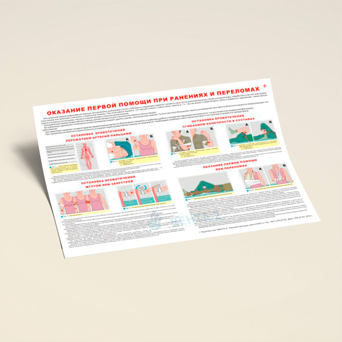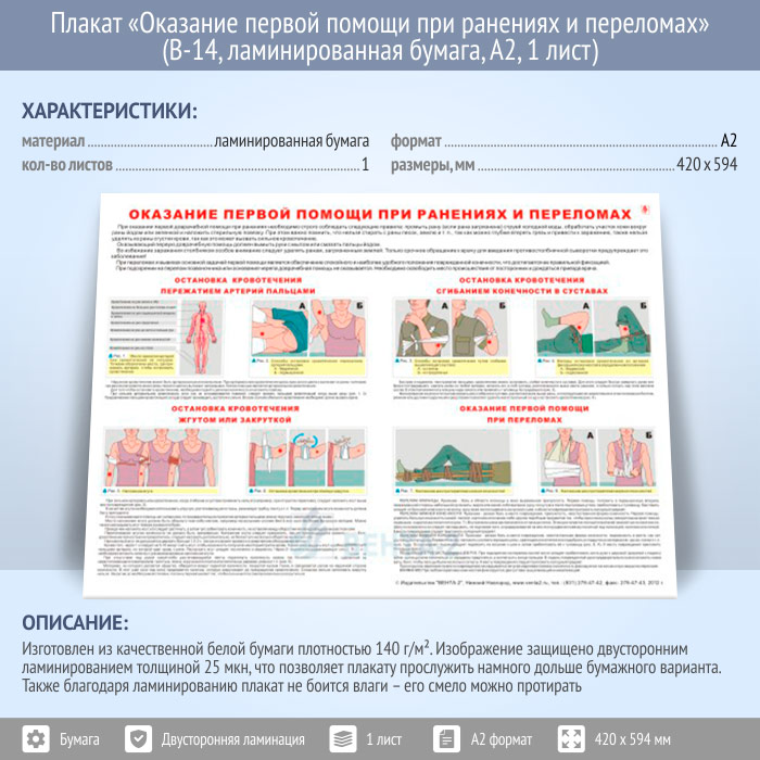 Плакат «Оказание первой помощи при ранениях и переломах» (В-14, ламинированная бумага, А2, 1 лист) в Химках купить