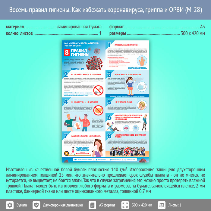 Плакат «Восемь правил гигиены. Как избежать коронавируса, гриппа и ОРВИ» (М-28, ламинированная бумага, А3, 1 лист) в Химках купить