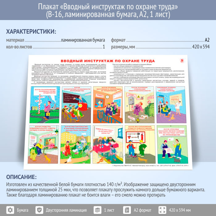 Плакат «Вводный инструктаж по охране труда» (В-16, ламинированная бумага, А2, 1 лист) в Химках купить