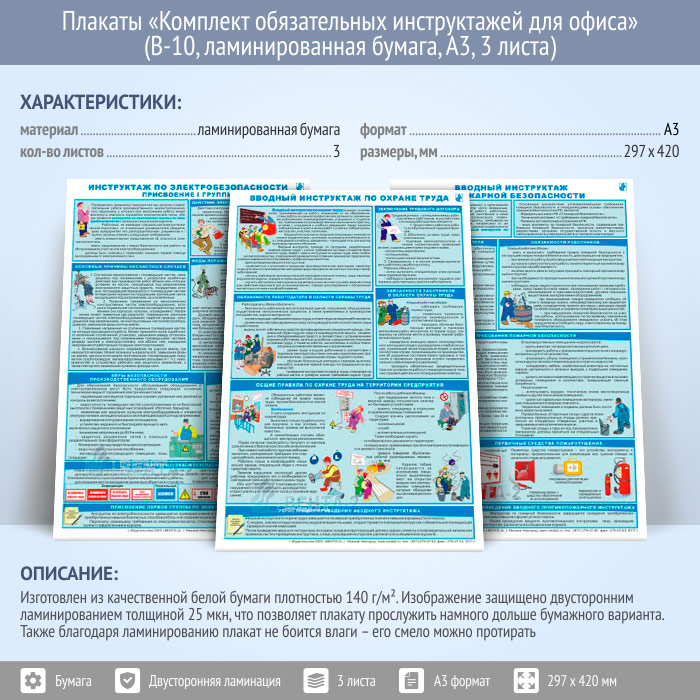 Плакаты «Комплект обязательных инструктажей для офиса» (В-10, ламинированная бумага, А3, 3 листа) в Химках купить