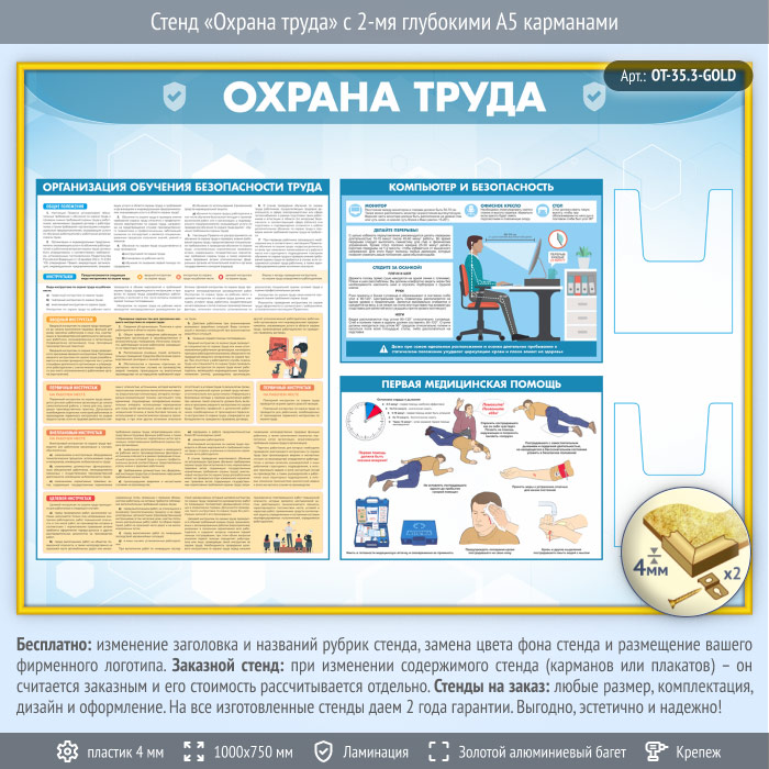 Стенд «Охрана труда» с 2-мя глубокими А5 карманами (OT-35.3-GOLD) в Химках купить