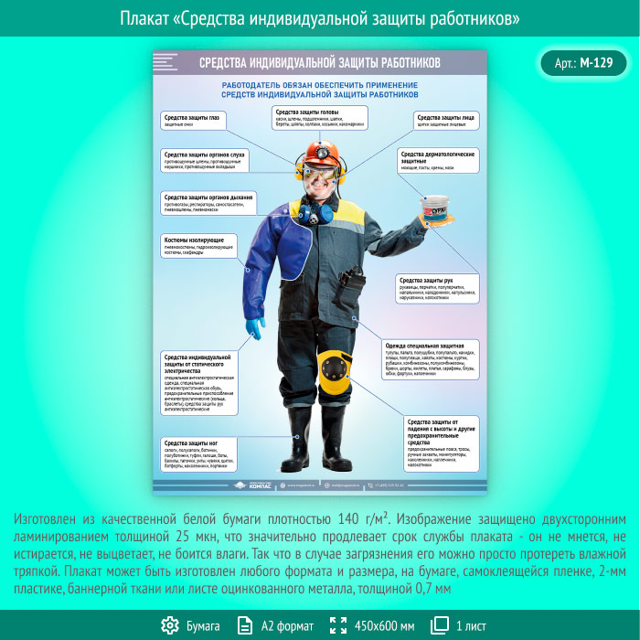 Плакат «Средства индивидуальной защиты работников» (М-129, ламинированная бумага, А2, 1 лист) в Химках купить