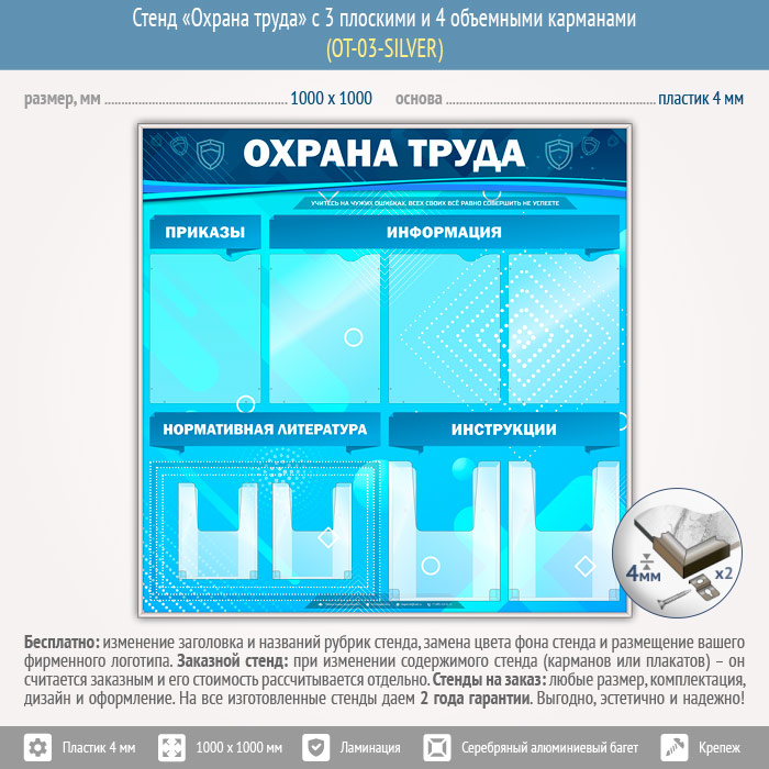 Стенд «Охрана труда» с 4 плоскими и 4 объемными карманами (OT-03-SILVER) в Химках купить
