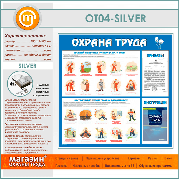 Стенд «Охрана труда» с плоским и объемным карманами (OT-04-SILVER) в Химках купить