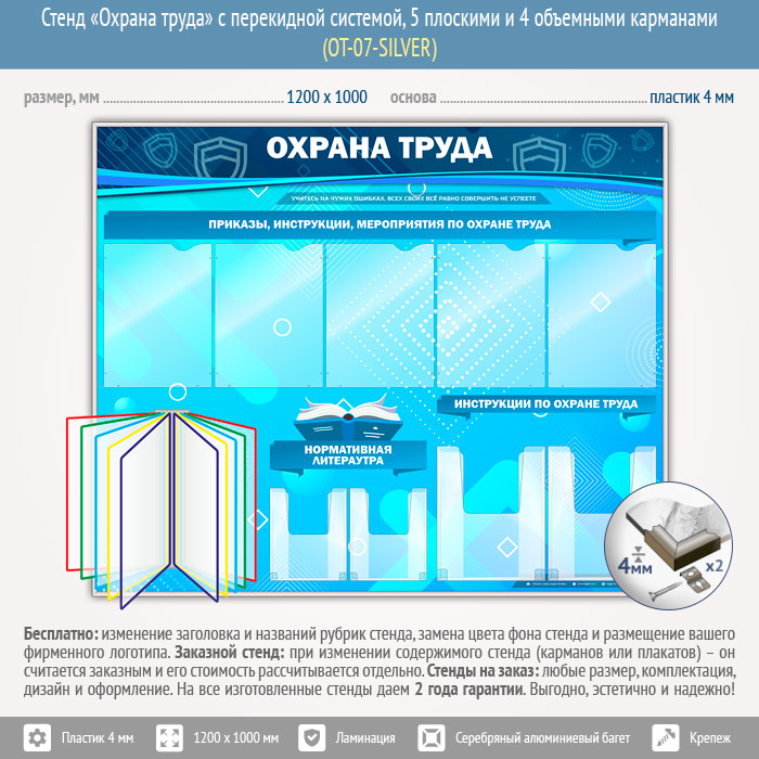 Стенд «Охрана труда» с перекидной системой, 5 плоскими и 4 объемными карманами (OT-07-SILVER) в Химках купить