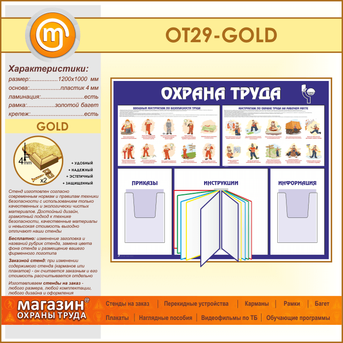 Стенд «Охрана труда» с перекидной системой и 2 объемными карманами (OT-29-GOLD) в Химках купить