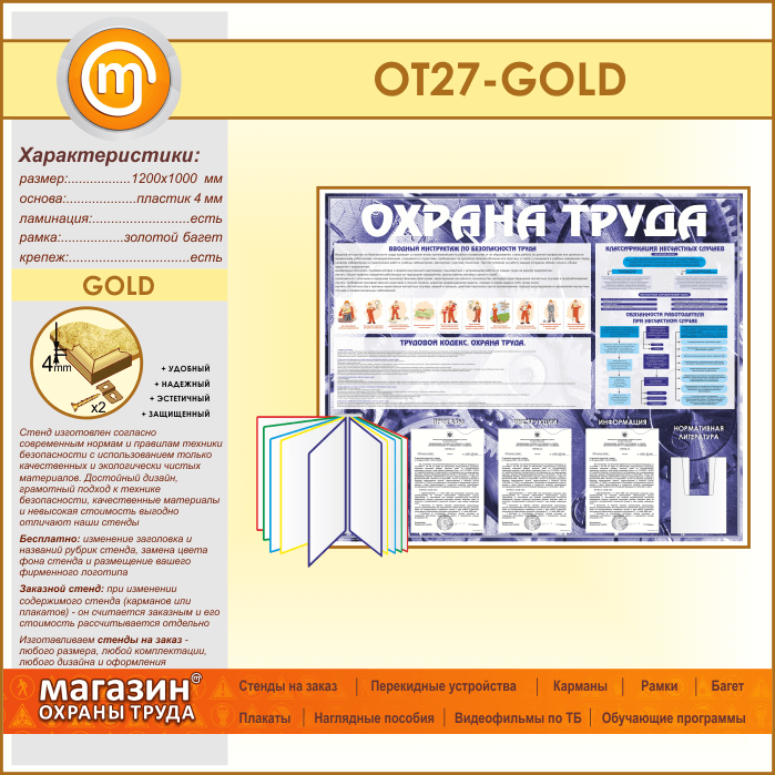 Стенд «Охрана труда» с перекидной системой, 3 плоскими и 1 объемным карманом (OT-27-GOLD) в Химках купить